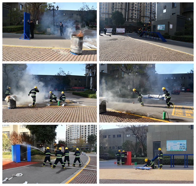 在实战演练阶段,按照演练流程,消控室人员接到消防监测系统报警后,马上查看火情及锁定位置,并向市消防大队报警救援,立即启动防火应急处置预案,迅速成立防火救援指挥部,同时组织小区消防应急队、社区医护人员、物业工作人员成立灭火组、疏散组、救护组、后勤组开展灭火任务。疏散组、救护组和后勤保障组迅速展开灭火疏散和自救行动;灭火组在队长的正确指挥下身着消防服、持灭火水带、手提灭火器,迅速到位,将“火”扑灭;救护组对伤员进行心肺复苏救援。整个过程紧张有序,各小组分工明确、默契配合圆满完成了演练任务。